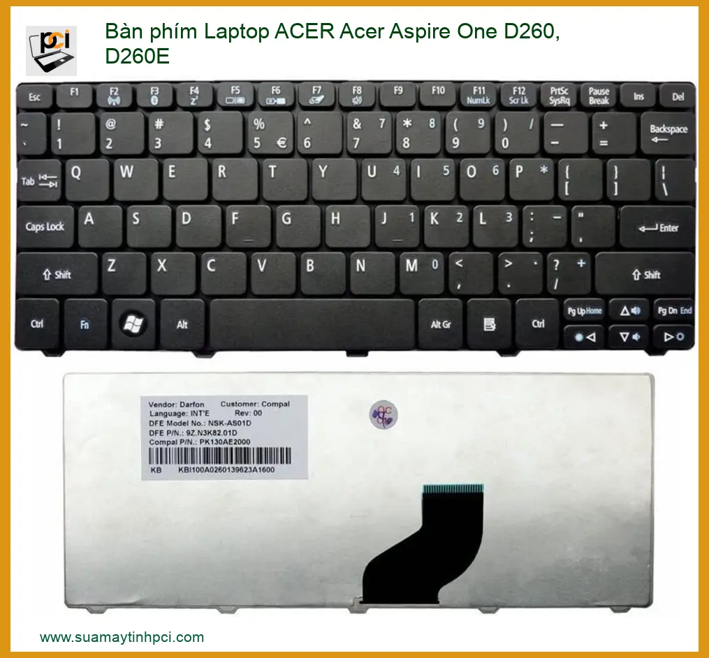 Bạn đang gặp rắc rối với chiếc bàn phím laptop Acer Aspire One D260, D260E bị liệt, loạn phím hoặc bong tróc do sử dụng lâu ngày? Đừng để sự cố này làm gián đoạn công việc của bạn. Tại Sửa máy tính PCI, chúng tôi cung cấp dịch vụ thay bàn phím laptop chuyên nghiệp, chất lượng cao giúp máy của bạn hoạt động ổn định như mới.